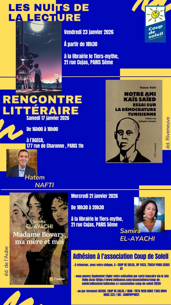 Prochains RDV de Coup de soleil à Paris Posté par Coup de soleil | 16 janvier 2026 | Actualités, Livre / BD, Rencontre / Conférence, Événements, Lire, écouter, voir | 0