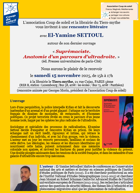 Rencontre avec Elyamine SETTOUL le samedi 15 novembre à la librairie le tiers-mythe Posté par Coup de soleil | 7 novembre 2025 | Actualités, Livre / BD, Événements, Lire, écouter, voir | 0