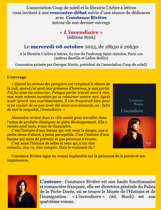 Rencontre le mercredi 8 octobre 2025 avec Constance Rivière autour de son roman « L’incendiaire » (éd. Stock) à la librairie L’arbre à lettres à Paris Posté par Coup de soleil | 2 octobre 2025 | Actualités, Livre / BD, Événements, Lire, écouter, voir | 0